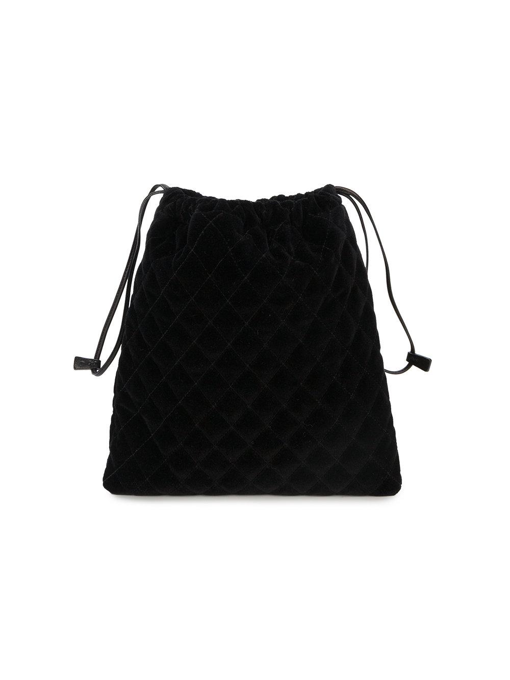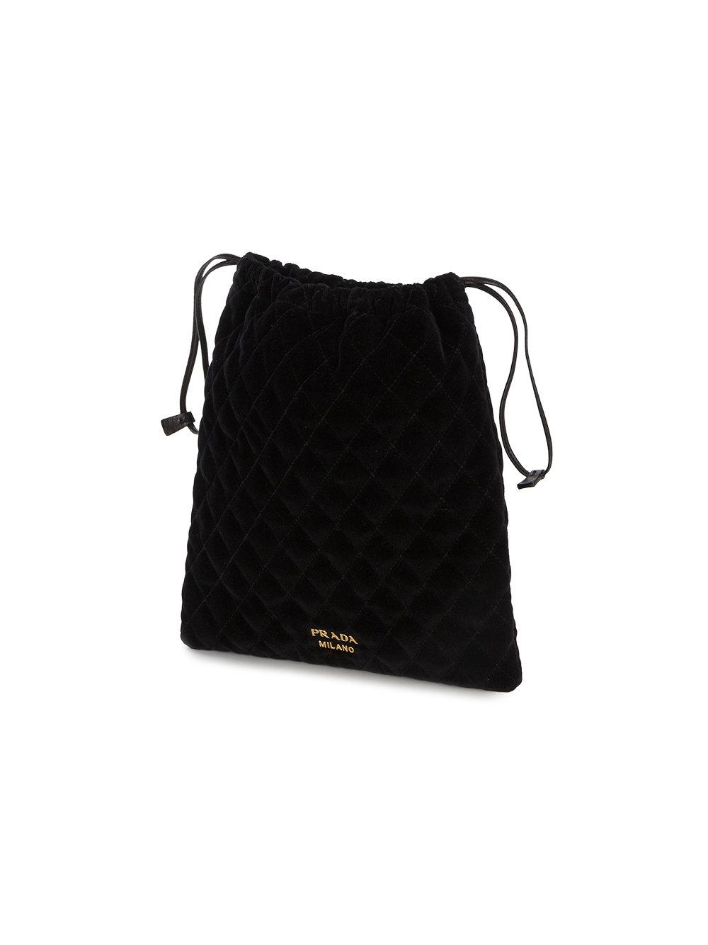 Black velvet Black quilted velvet pouch from Prada featuring a drawstring fastening and a gold-tone logo plaque. Material:Leather/Velvet. This item may not be on sale in France, UK, Italy, Belgium and Switzerland.