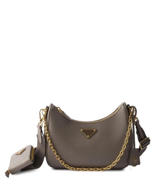 Grey removable chain handle detachable and adjustable shoulder strap triangle logo zip closure Size: OS. Gender: Female. Material:Calf Leather/Nylon. Colour: brown