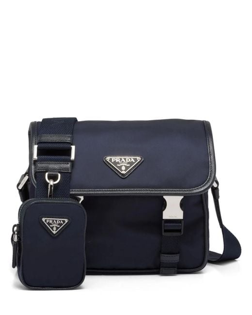 Navy blue recycled nylon Saffiano leather adjustable nylon tape and leather shoulder strap removable pouch triangle logo foldover top with buckle fastening main compartment internal zip pocket logo-print re-nylon lining Size: OS. Gender: Male. Material:Calf Leather/Recycled Polyamide. Colour: blue