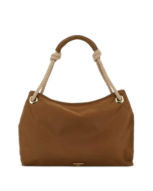Caramel brown gold-tone hardware two rope top handles triangle logo main compartment Size: OS. Gender: Female. Material:Fabric. Colour: brown