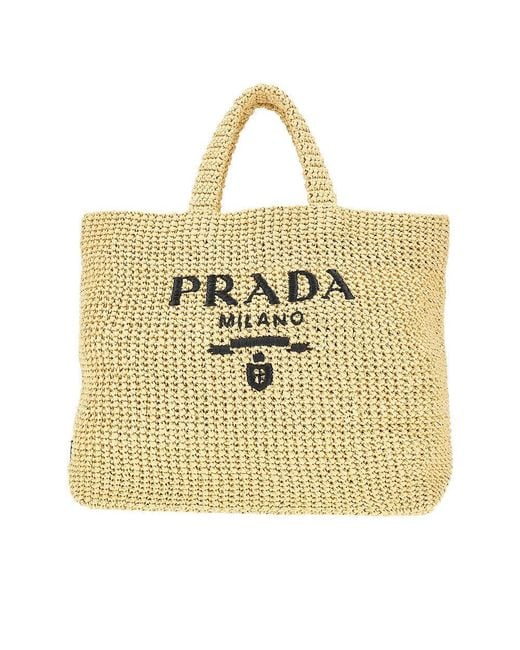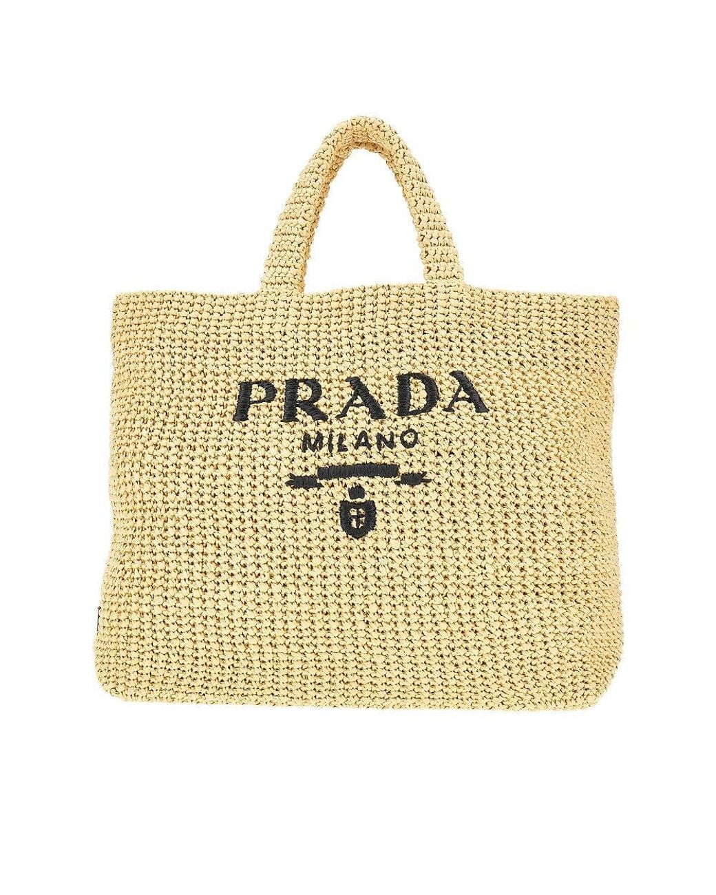 Tote bag made from woven raffia, enriched with front "Prada Milano" logo embroidery and leather patch with signature enamel and gold-finished metal triangle logo on the side. Double handle. Unlined. Colour: metallic