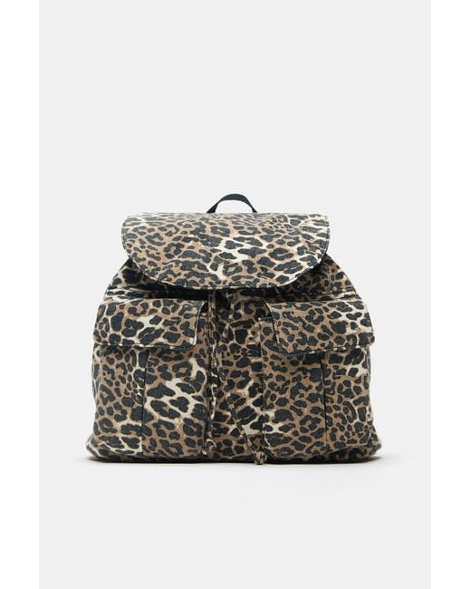 Canvas backpack with an animal print. Front pockets. Short carry handle and adjustable shoulder straps. Gathered closure and magnetic flap. Height x Length x Width: 29 x 36.4 x 19.5 cm. Colour: grey