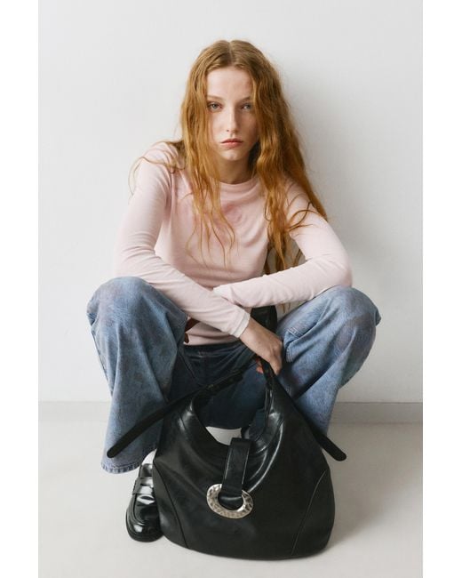 Tote bag available in black. Ring detail on the front strap. Long adjustable shoulder strap. Magnetic clasp closure. Height x Width x Depth: 35.9 x 28.7 x 15.3 cm. Colour: black