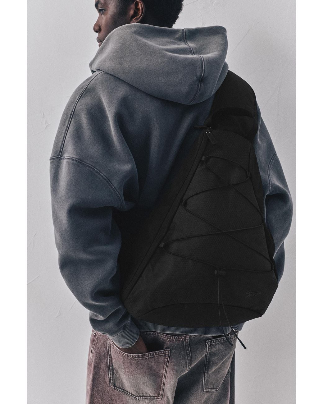 Technical backpack available in black. STWD logo on the front. Adjustable rubber strap detail on the front. Short hand strap and long crossbody top strap. Zip fastening. Height x Width x Depth: 48.8 x 35.6 x 13.6 cm. Colour: black