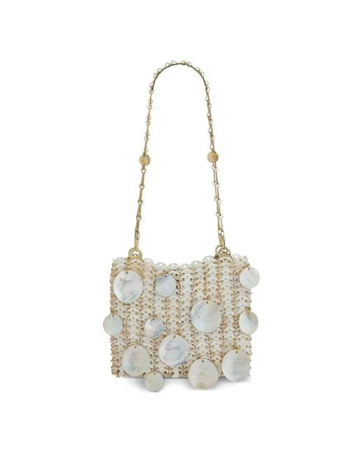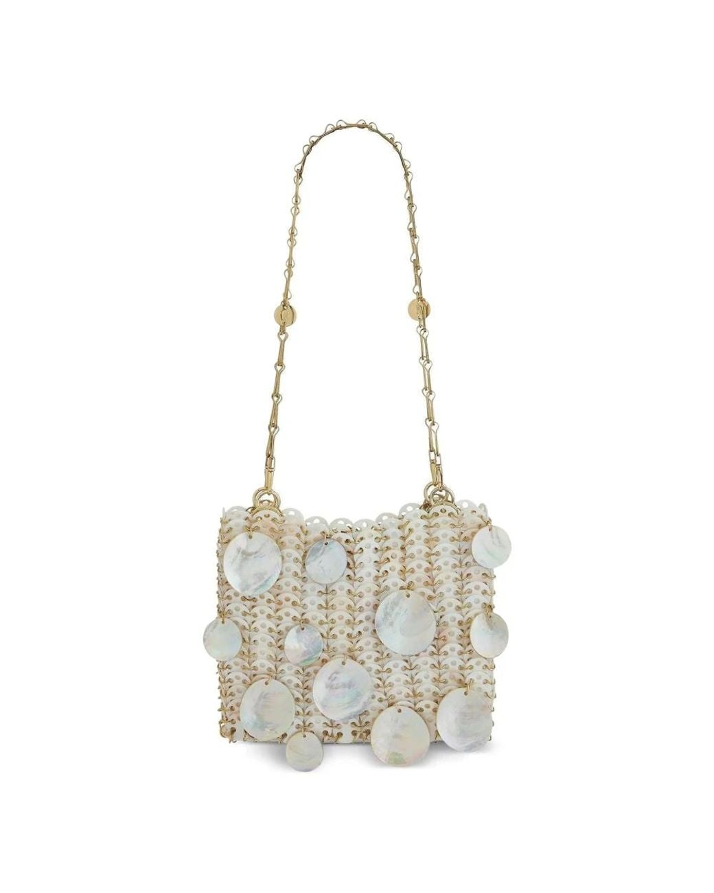 Rabanne mini bag with 1969 shell decoration, gold chain shoulder strap, scalloped edge, woven pattern, and shell details. Colour: metallic