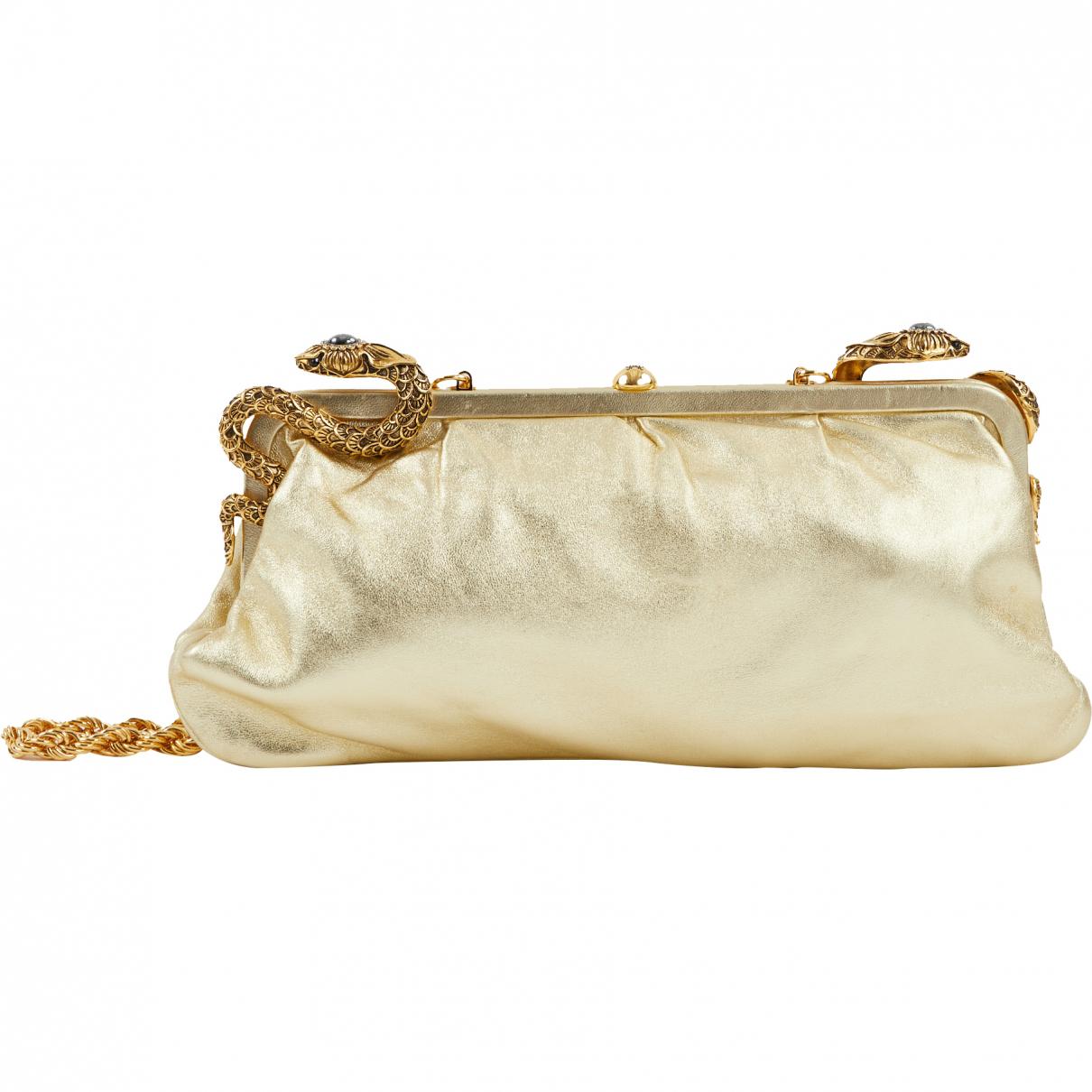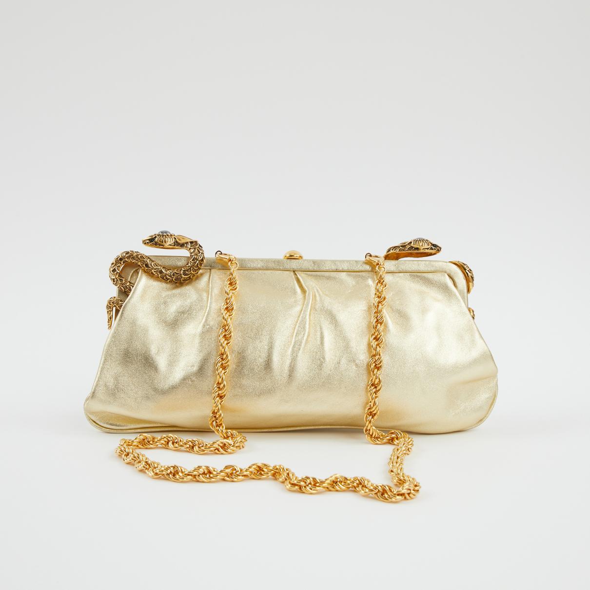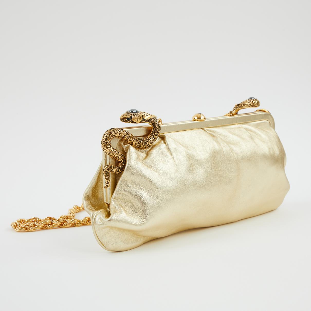 Go to Vestiaire CollectiveGold leather clutch, non-adjustable removable golden tone chain, golden tone hardware, two snakes embellished with strass, clasp closure, one inner compartment, one zipped pocket, security hologramm inside the bag. No packaging. To note : some marks on the leather on the back. Chain drop : 41,5 cm, chain length : 84,5 cm. Colour: metallic