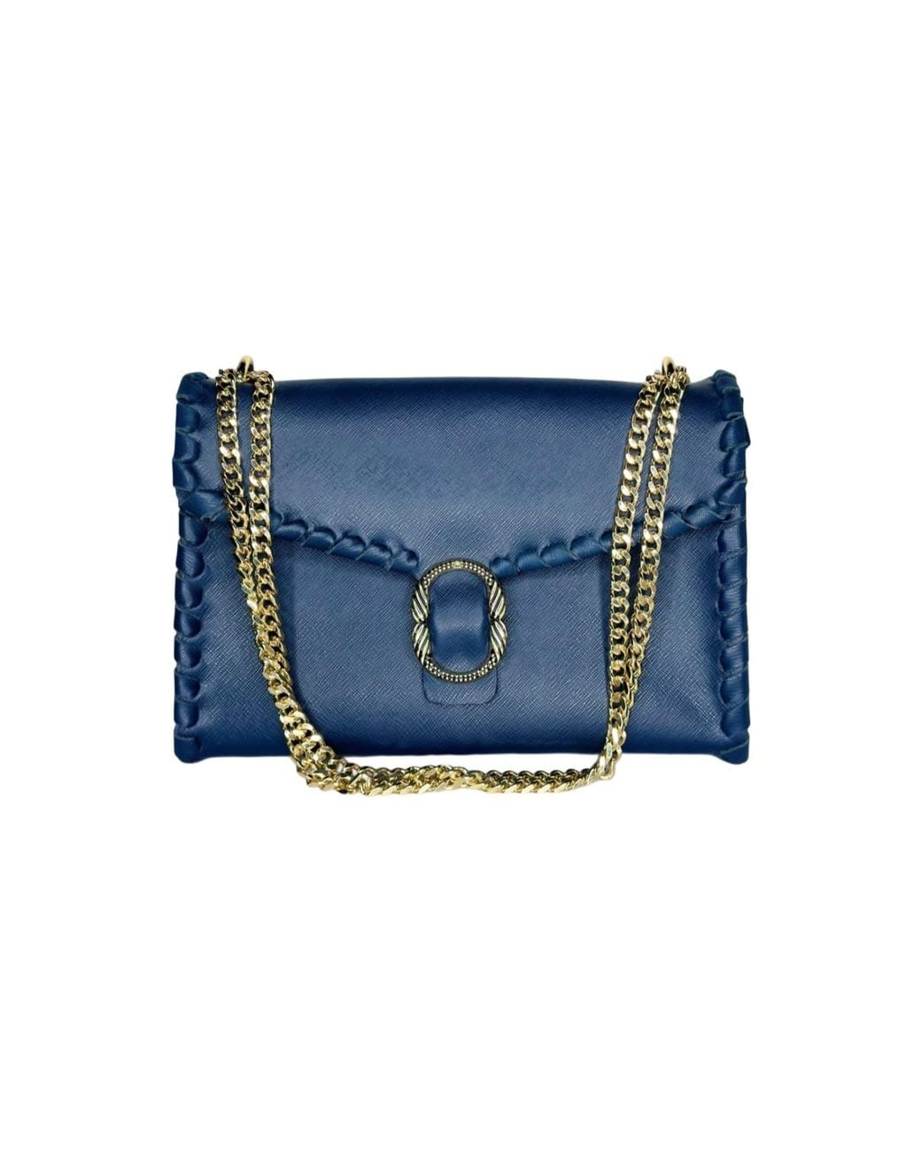 The Sholder bag by Ruj H. is crafted from saffiano calfskin with a cherry red nappa leather lining and an interior pocket. The bag closes with a magnetic button embellished with an inlaid jewel detail that recalls the intricate saddle stitching that characterizes the minimalist design. The double chain allows the bag to be worn over the shoulder or cross-body. This product was made using artisanal, not industrial, processes. Any imperfections are a guarantee of a handmade item and certify the authenticity of the Ruj H. brand, contributing to its Italian cultural value. Please note that Ruj Heritage models are constantly evolving, but their availability is limited in terms of material and colour variations. For smooth, laminated, mirrored, and grained leathers, we recommend using cleansing milk to maintain the item's appearance. It can dissolve some types of damage, fill in scratches, and soothe most stains. For split leathers and suede, we recommend combing the leather with a bristle brush and scrubbing stains with special shoemaking products. Do not wash; do not bleach; do not tumble dry; do not iron; do not dry clean; do not wet clean. Leather 95%, Metallic 5% Colour: blue