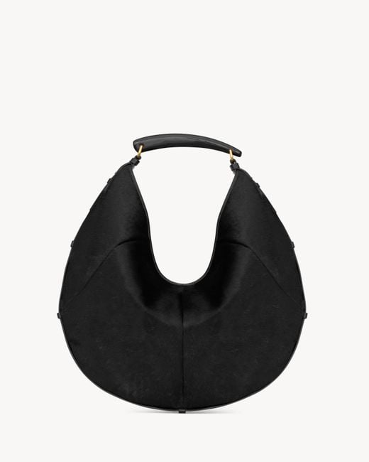 A modern revival of the archival mombasa hobo bag in pony hair leather, lined in tonal suede. this spacious, casual silhouette is elevated with an horn handle for hand or shoulder carry.