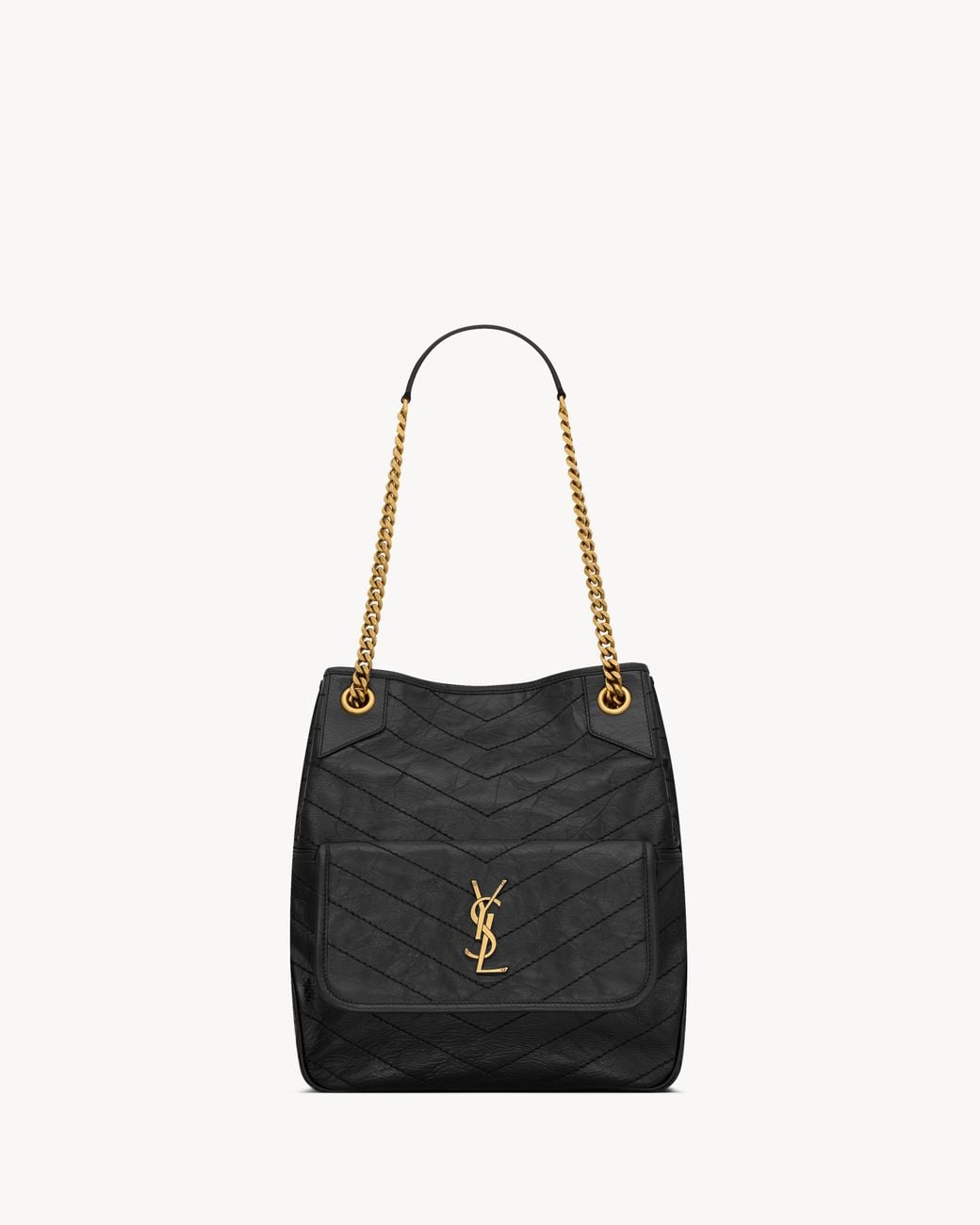 Shopping bag in vintage calfskin, decorated with the cassandre and chevron-quilted topstitching. this lightweight, functional bag features a front pocket and sliding chain strap for both shoulder and crossbody carry. Colour: black