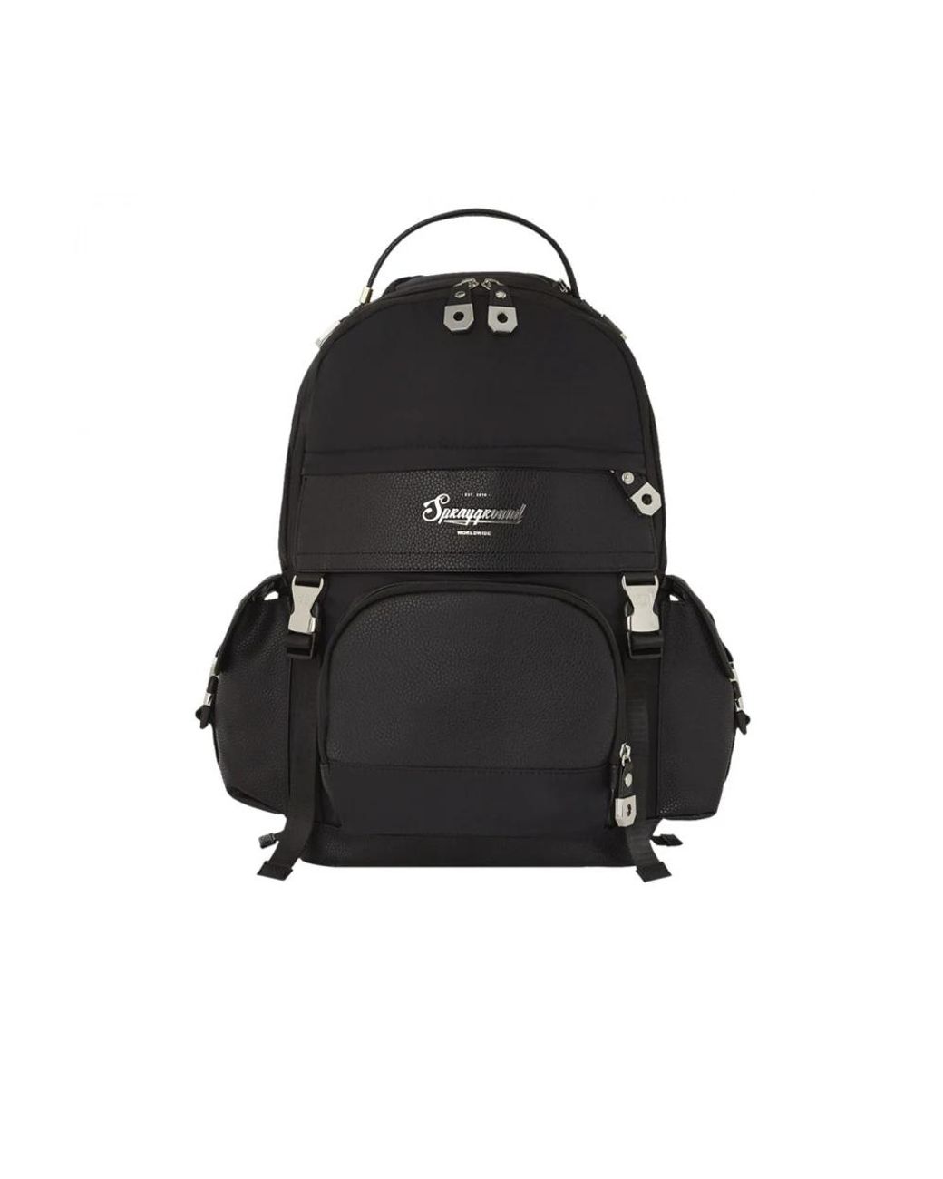 Upgrade your style with this Sprayground backpack featuring a metallic logo, multiple compartments, padded back, adjustable shoulder straps, and the iconic 'Sprayground Authentic' badge. Perfect for the modern man on the go. Color: Black. Material: 100% Pvc, lining: 100% polyester. Dimensions: H 46cm x W 15cm x L 29cm (18.11 x 6 x 11.4 inches). Colour: black