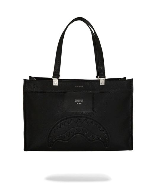 Your over the shoulder bag doesn't have to be boring anymore. Stand out with the printed Sprayground Totes PRODUCT DETAILS Cut and sew sharkmouth shape with embossed silver foil lettering Tote H12 x W 14 x D 7 Interior zipper pocket Interior mobile phone pocket Snap closure Removable/ Adjustable cross-body strap Comfortable fits a 14 laptop Colour: black
