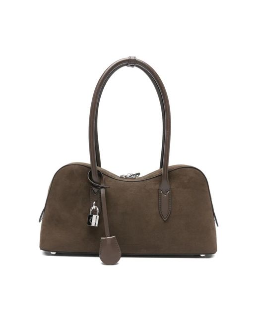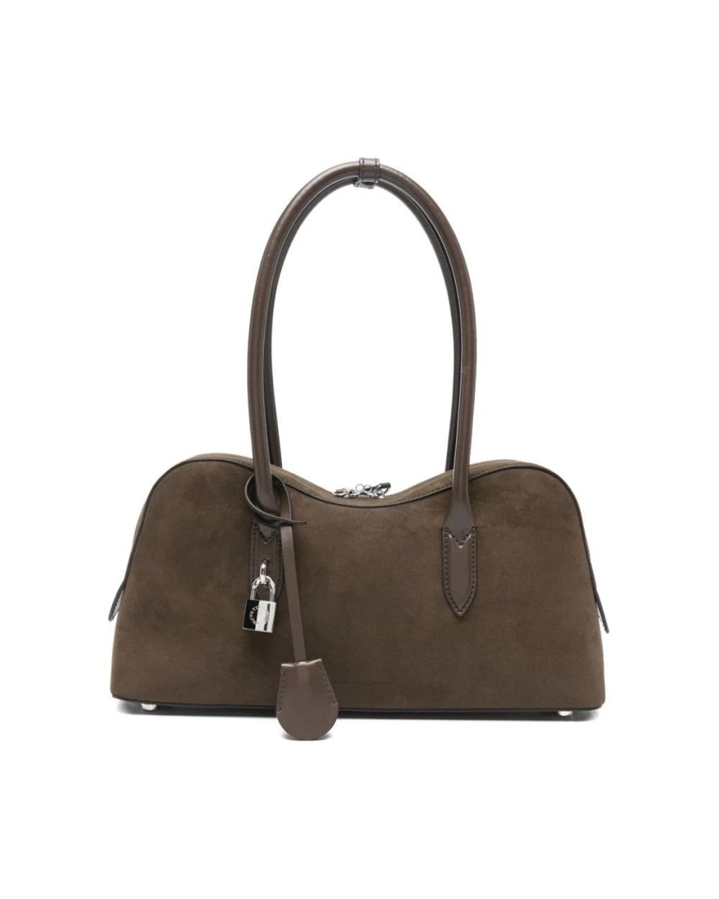 Stella Mc Cartney presents the Ryder Medium Shoulder Bag, a structured top-handle bag with a zip-top fastening and signature padlock detail. Designed for everyday use, it combines a suede-effect texture with silver-tone hardware for a polished look. Key attributes: Brown | Marrone | Suede-effect fabric | Double top handles | Zip-top fastening | Interior pockets | Protective metal feet | Protective dust bag included | Top-handle silhouette | Silver-tone hardware | Padlock charm detail | Structured shape | Suede-effect texture | Smooth faux-leather trims | Dimensions & fit: Depth 10 cm | Height 19.5 cm | Width 36 cm | Strap 22 cm | Composition & care: 70% true hemp | 30% lyocell Colour: brown