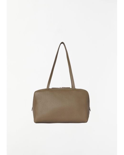 The Row black bowling bag with a. Turned-edge construction and elongated flat handles. In grained calfskin leather. Features a dual zipper closure, an interior zipper pocket and slip pocket. Finished with antique silver hardware. Lined in fine lambskin leather. Measures approximately: 12 W x 7 Hx 4 D in. 100%. Calfskin Leather. Lining: 100%. Lambskin Leather. Made in Italy. Colour: black