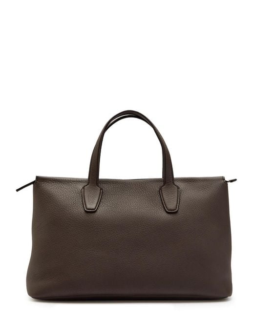 Info & Care The Row grained leather tote Two top handles, debossed logo at front, internal zip-fastening pocket, fully lined Zip fastening across top Size & Fit Width: 13 inches/ 33cm Height: 8 inches/ 20.5cm Depth: 5 inches/ 12.5cm Top handle drop: 4.5 inches/ 11.5cm; Colour: brown
