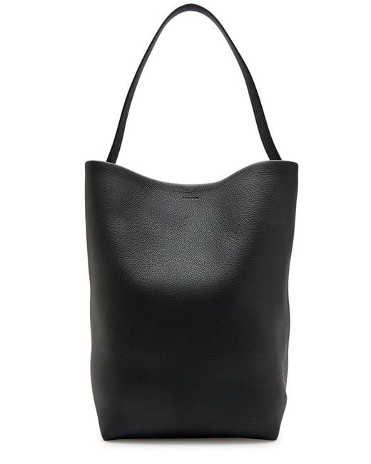 Info & Care The Row grained leather tote Shoulder strap, designer stamp, fully lined Tie fastening at open top; Size & Fit Width:;9;inches/ 23cm; Height: 14 inches/ 35.5cm; Depth:;9;inches/ 23cm; Shoulder strap drop: 9;inches/ 23cm; Colour: black