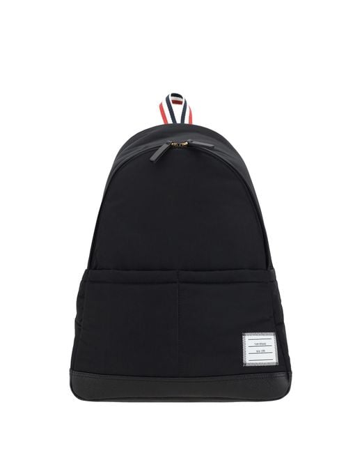 Thom browne's backpack features a double-slider zipper closure for easy access. adjustable, padded shoulder straps provide comfort, while the top handle offers a second carrying option. two side welt pockets and a front patch pocket provide ample space for essentials. the brand's iconic monogram patch applied to the front and the inner lining with the brand's classic colored bands add a distinctive touch. inside, the backpack features a single compartment, combining practicality and style. Composition: 100% % PolyesterComposition: 100% Polyester Combo1:, 100% Calf Full Gr