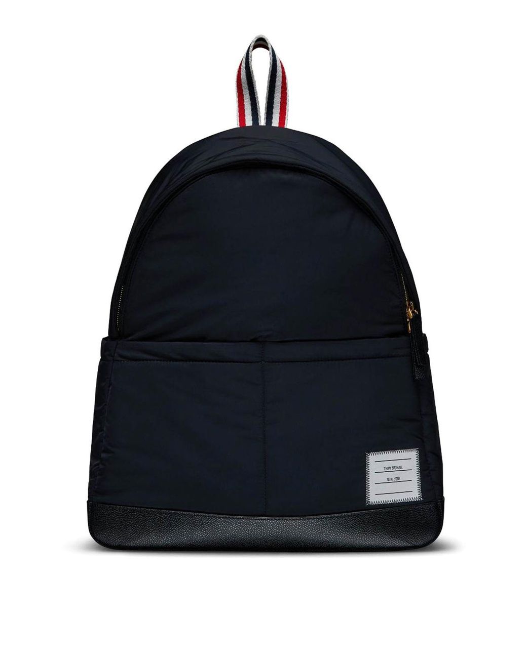 Black appliqu logo two-way zip fastening single flat top handle two padded adjustable shoulder straps front patch pocket two side slit pockets main compartment striped lining internal logo tag Colour: blue
