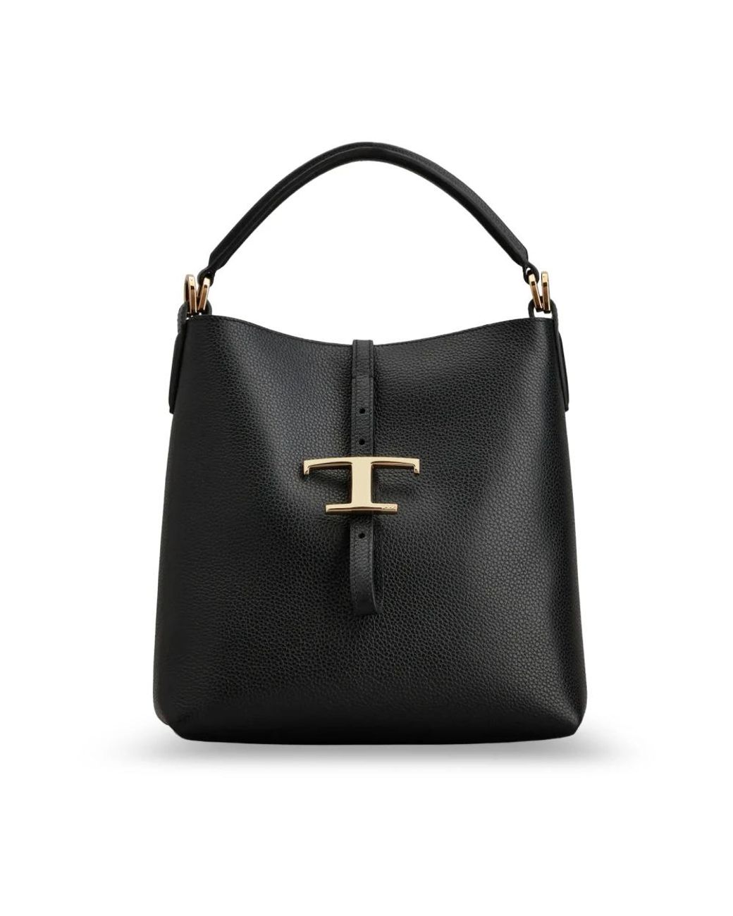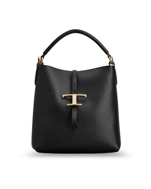 Tod's T Timeless mini bucket bag is a compact, Italian-made bucket bag crafted in grained calfskin. Its standout features are the top handle and an adjustable, removable shoulder strap for versatile carry. Key attributes: Black | Calfskin | Adjustable and removable shoulder strap | Fixed top handle | Flat interior pocket | Dust bag included | Bucket shape | Flap closure with metal T charm | Grained calfskin texture | Top handle | Dimensions & fit: L 23 cm x A 23 cm x P 10 cm | Handle height (drop): 11 cm | Adjustable/removable shoulder strap: drop 52 cm (from central hole), max length 110 cm | Composition & care: Exterior: 100% calfskin | Interior: 100% suede | Details: brass