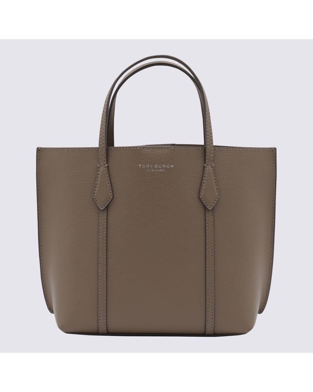Brown leather Perry tote bag from Tory Burch featuring top handles, printed logo, adjustable and removable shoulder strap and compartments. Composition: _, 100% Le
