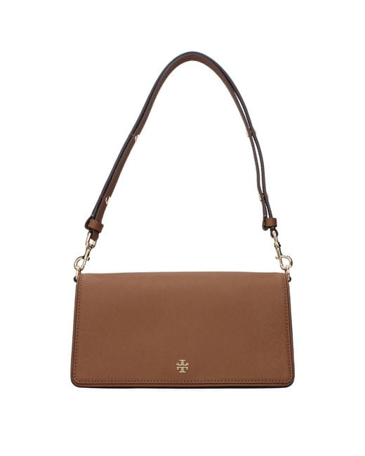 The item with MPN 157617909 and code F83370 model emerson in leather of color brown belongs to the shoulder bags category by designer Tory Burch. It features characteristics such as front logo, internal divider pocket, adjustable handle, removable handle.