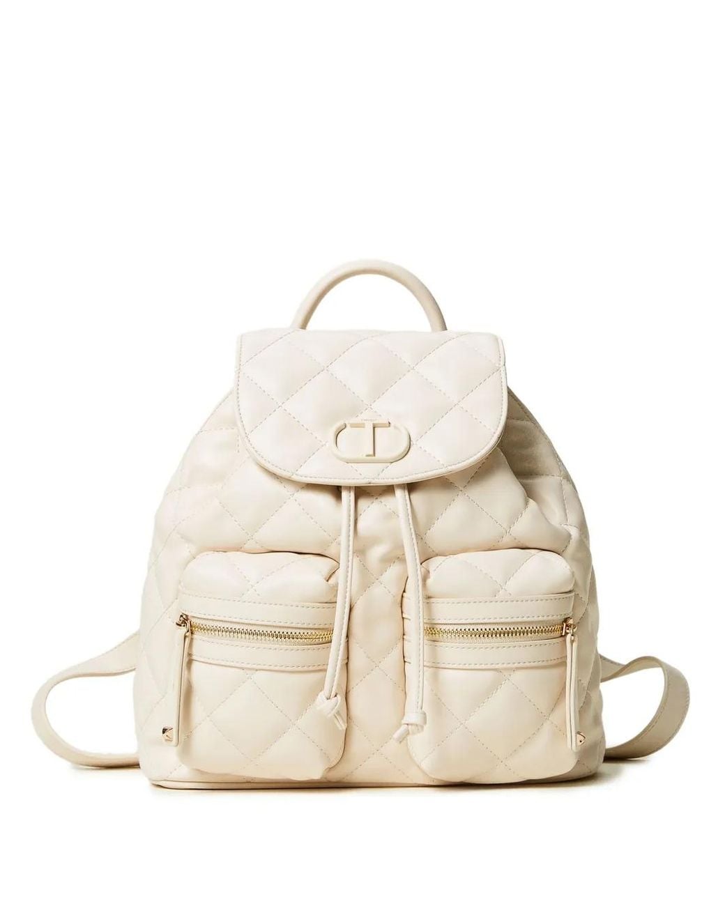 Cream white quilted tonal logo plaque foldover top with magnetic fastening drawstring fastening front zip fastening pockets adjustable shoulder straps main compartment Size: One Size. Gender: Female. Material:Polyurethane/Polyester. Colour: white