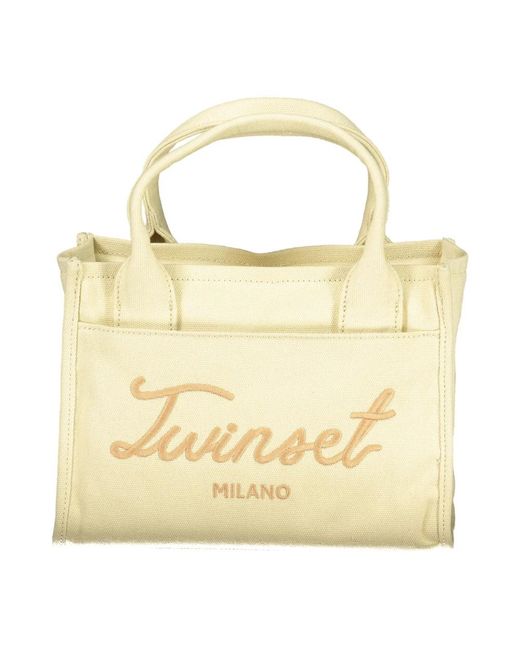 Twinset tote bag featuring embroidered logo detailing and a removable, adjustable shoulder strap for versatile carry. Spacious design with external and internal pockets keeps essentials organized. Key attributes: Beige | Two handles | Adjustable and removable shoulder strap | One external pocket | One internal pocket | Zip closure | Embroidery | Logo Colour: metallic