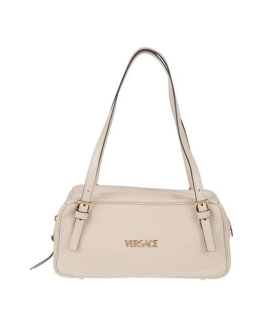 Versace Tag Bag is a compact top-handle shoulder bag featuring adjustable double top handles and a secure zip closure. Its structured silhouette suits everyday and evening use. Key attributes: Yellow | Cream Versace Gold | Leather | Adjustable double top handles with double buckles | Zip closure | Logo hardware | Top-handle silhouette | Compact structured shape | Shoulder bag design | Dimensions & fit: 31 x 14 x 12 cm | Composition & care: 100% lamb leather Colour: natural
