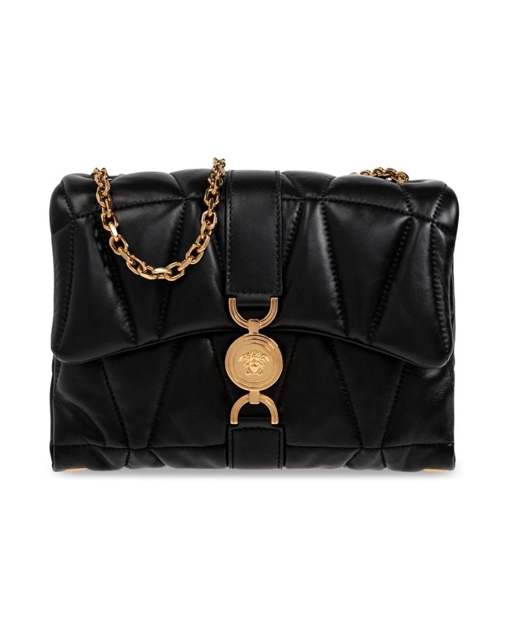 Shoulder bag "Kleio" from the exclusive Versace collection is thequintessence of class and elegance. Made from black, glossy leather,it features a rectangular shape with a quilted pattern that adds amodern character. Unique details, such as the gold decorative element on the front andthe decorative gold chain as a strap, emphasize the bag`ssophisticated style. A subtle brand logo on the back and a magneticflap closure complete the whole, providing not only aesthetics butalso functionality. The interior of the bag is kept in black, with three separatecompartments and a slip pocket, making it practical and convenient foreveryday use. WHY Should YOU BUY This Product? * Exclusive Leather – top-quality material. * Elegant Design – modern quilted pattern. * Functionality – three compartments and an inner pocket. * Authenticity – subtle Versace brand logo. * Refined Details – gold chain and decorative element. Height: 15cm Width at widest point: 22cm Bottom width: 10cm Model`s measurements: Height: 176cm Bust: 85cm Waist: 60cm Hips: 89cm Colour: black