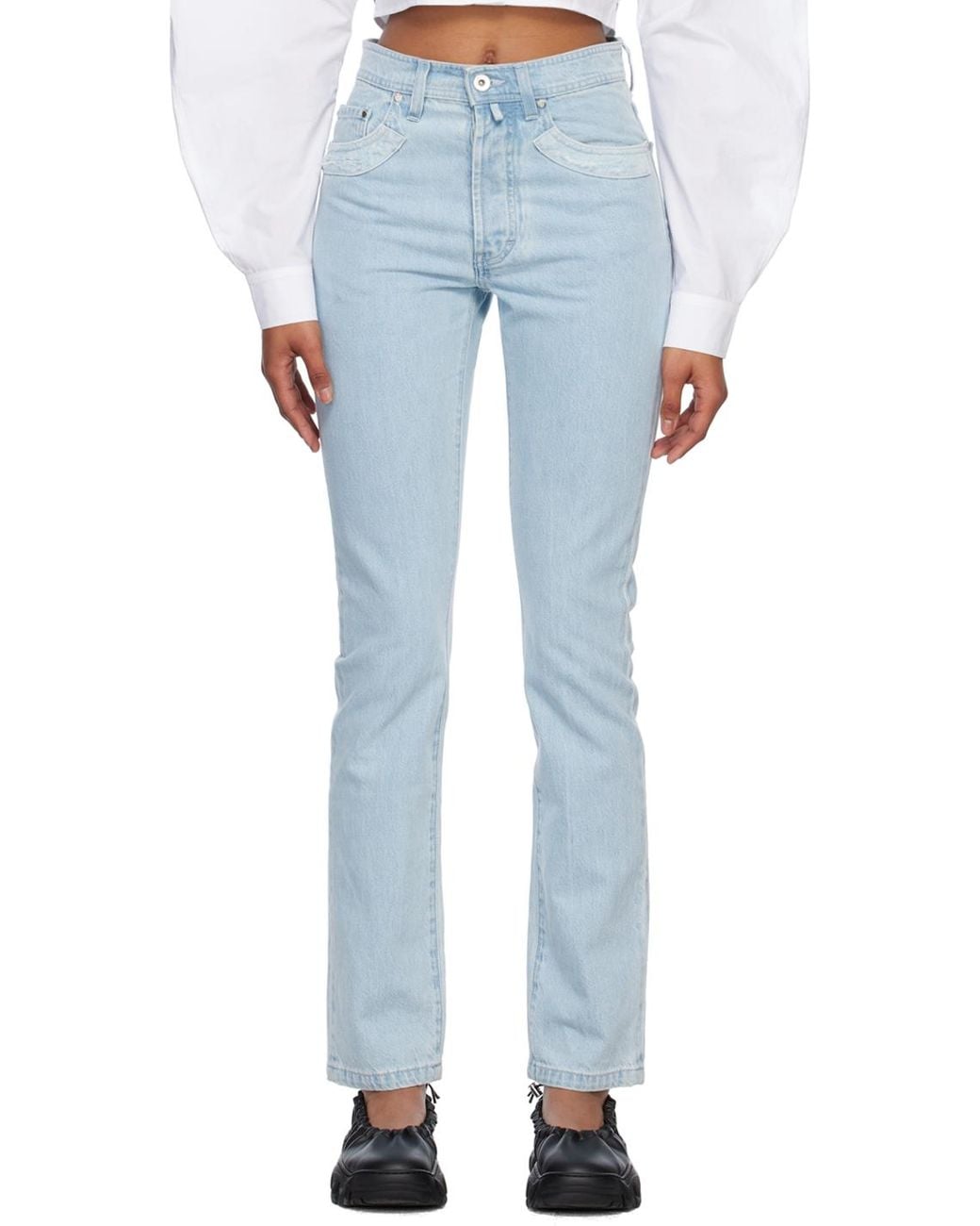 Enzyme-washed non-stretch organic cotton denim jeans. Fading and distressing throughout. · Belt loops · Five-pocket styling · Button-fly · Logo plaque at back waistband · Embroidered patch at back pocket · Logo-engraved silver-tone hardware Supplier color: Light blue
