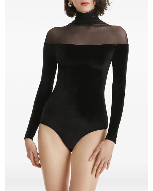 Black mesh panel high neck long sleeves Just a reminder that this piece must be tried on over your own garments. Size: XXS. Gender: Female. Material:Velvet/Mesh. Colour: black