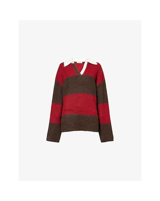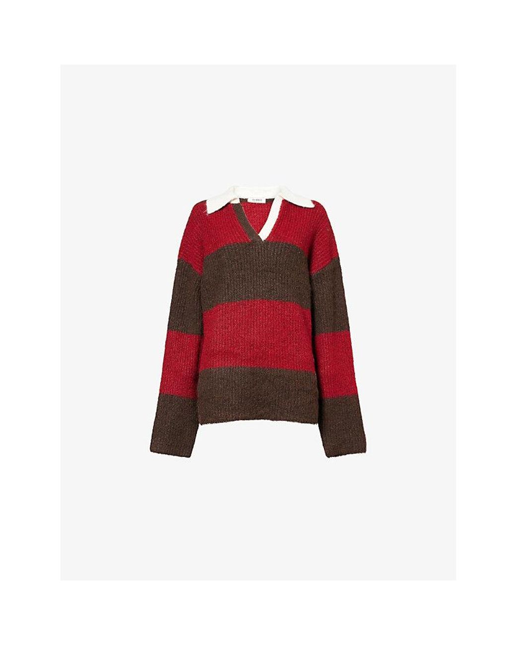 4th Reckless knitted jumper70% polyester, 21% nylon, 8% wool, 1% elastaneOversized relaxed fit, contrast-knit open collar, dropped shoulders, long sleeves, all-over large vertical stripesMachine wash coldTrue to sizeModel is 5ft 10in/1.78m and wears a size smallMidweight, stretchy Colour: red