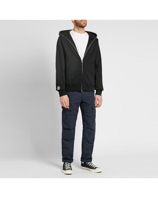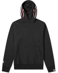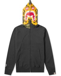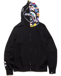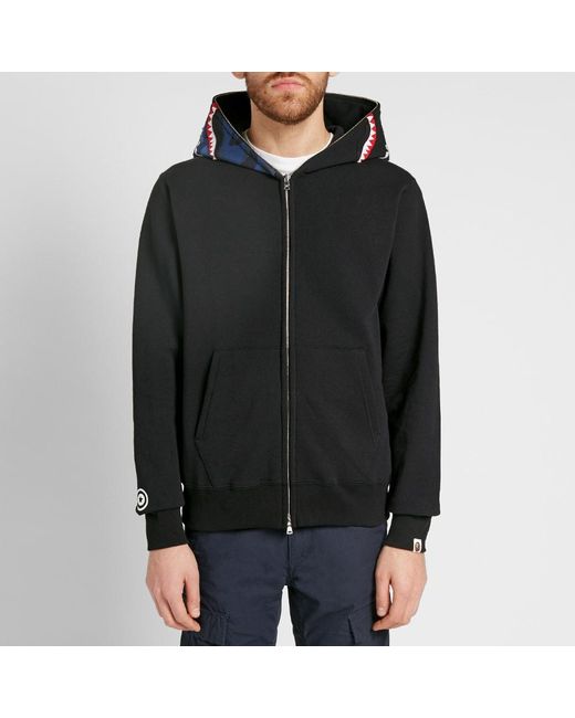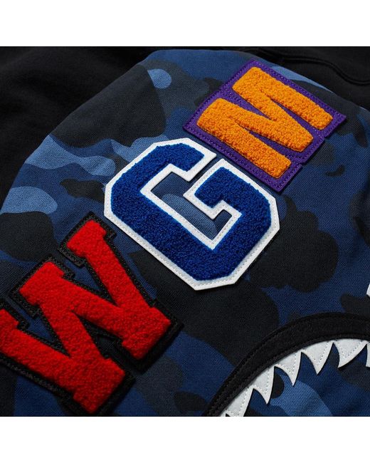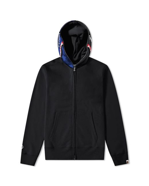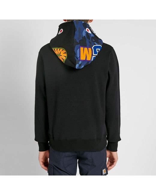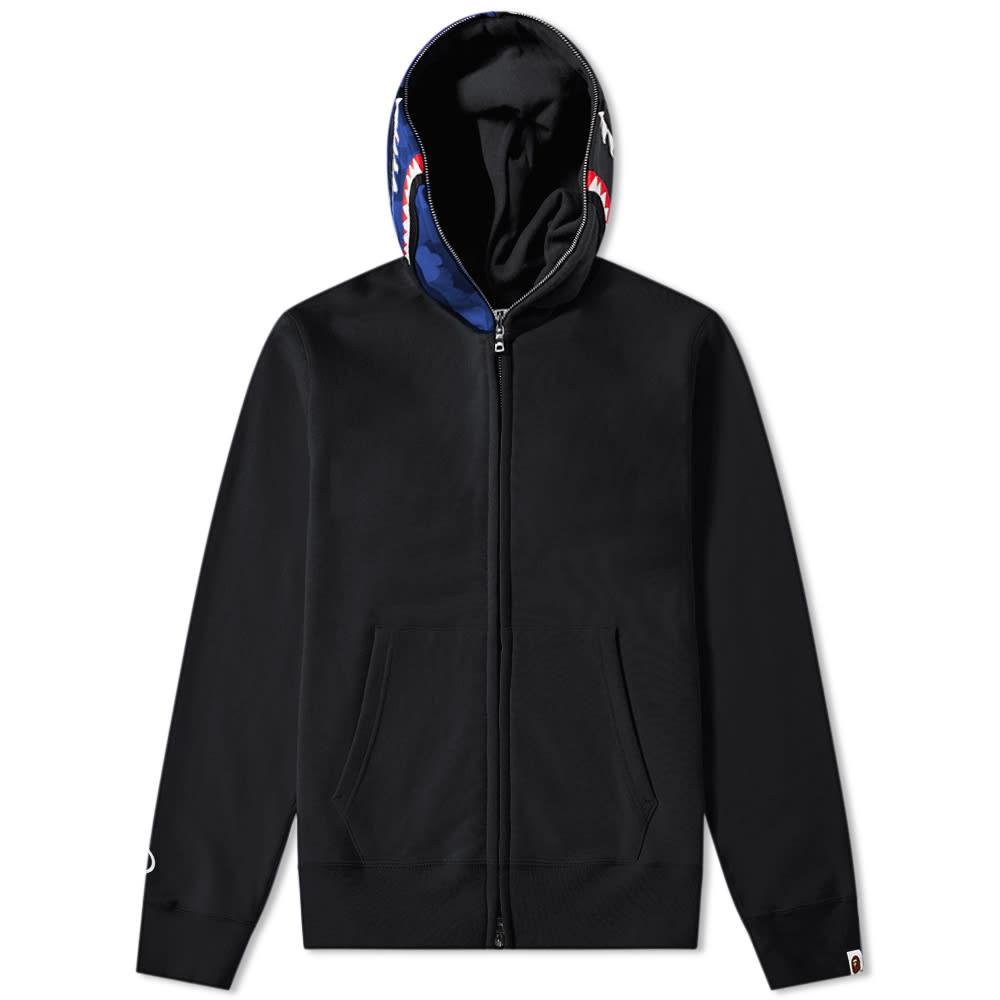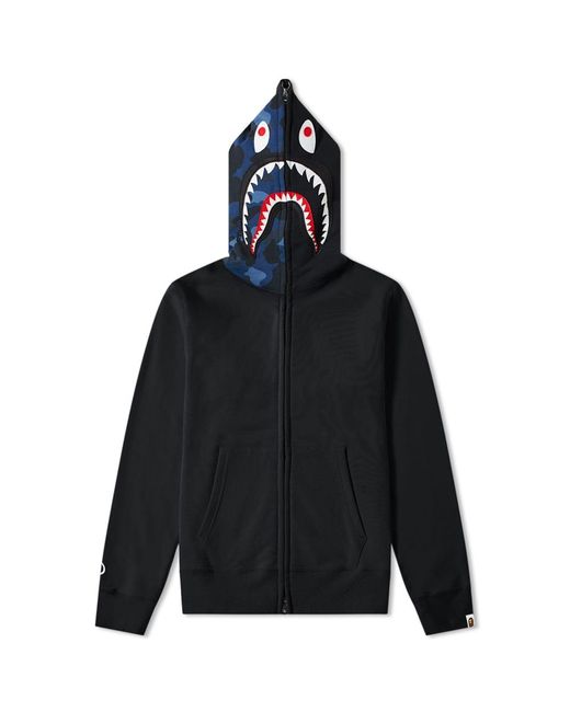 The full-zip hoody by A Bathing Ape is as iconic as items of streetwear come. Instantly recognisable, the hotly desired style features a zip closure that fastens over the wearers face, creating a mask-like effect. This version is predominantly black, save for the flash of blue camo on one side of the mask – which this time takes the shape of the brand's shark motif. On the back of the hood, the letters 'WGM' – standing for World Gone Mad – are appliquéd in varsity style script. 100% Cotton. Fixed Hood. Zip Closure. Split Kangaroo Pocket. Printed & Appliqué Branding. Made in Japan. Colour: black
