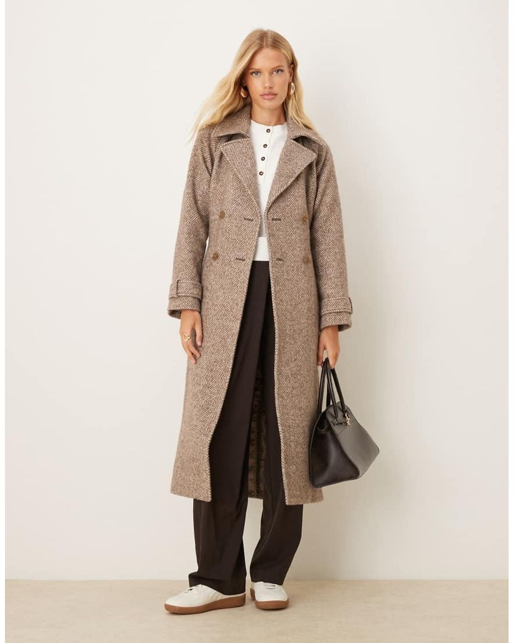 Wool Blend Tailored Herringbone Top Coat - Brown