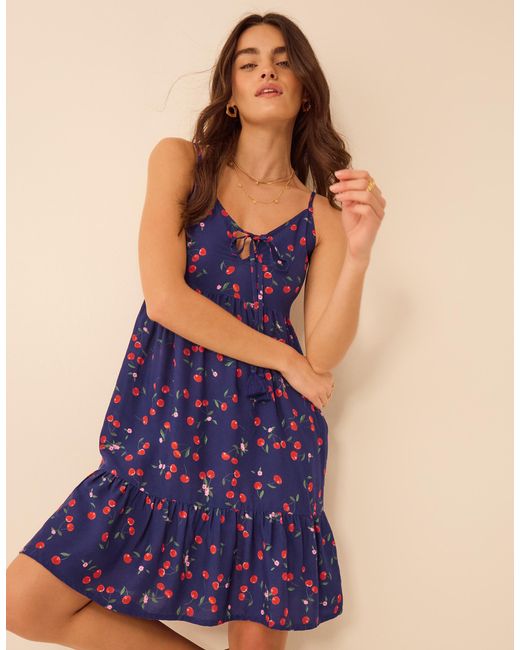 Women's Blue Cherry Print Tassel Tie Mini Dress
