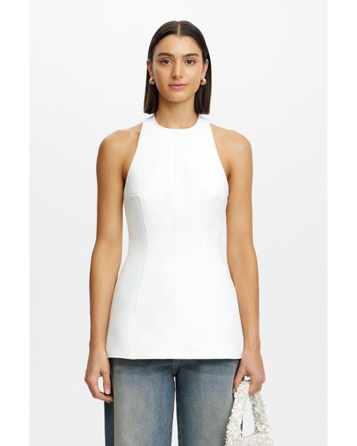 Introducing the Hawick top in ivory, a sleek silhouette designed for versatile styling. This high-neck top features a flared hem with side splits, a bonded fabrication, and tonal hardware at the back. It's fitted through the bodice and has a centre back zip. The Hawick top is perfect for pairing with trousers or long skirts, offering modern minimalism. Made from 100% polyester main face, 95% polyester and 5% elastane main base, and 97% polyester and 3% elastane lining. The model is 175cm / 5'9" wearing an AU 8 / US 4. Colour: white