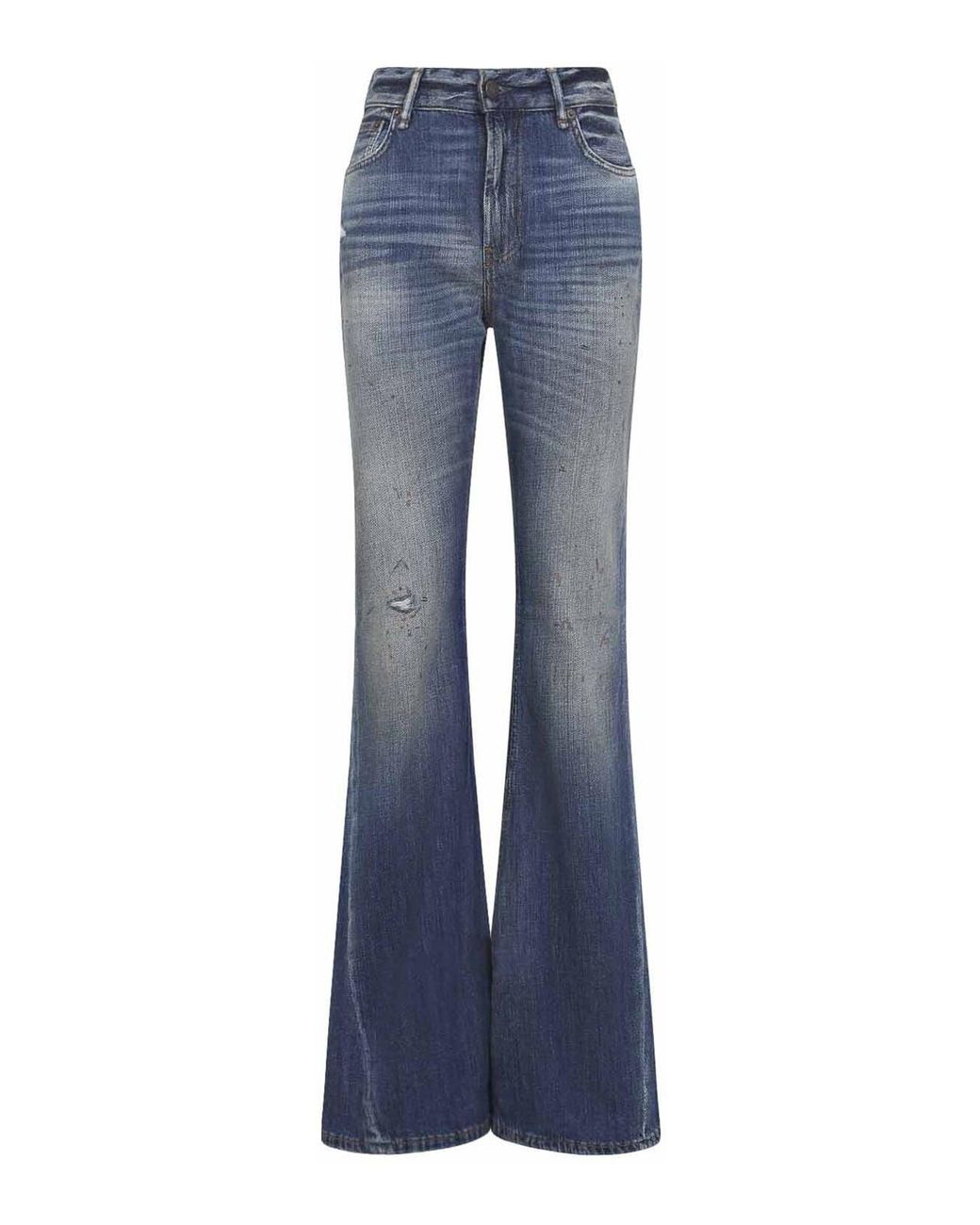 Acne studios 2025f blue cotton jeans. fitted jeans crafted from bleached mid-blue cotton denim, featuring a high waist, belt loops, 5-pocket construction, a front button and zip fly, a branded leather label at the back of the waist, and a skinny boot leg. Colour: blue