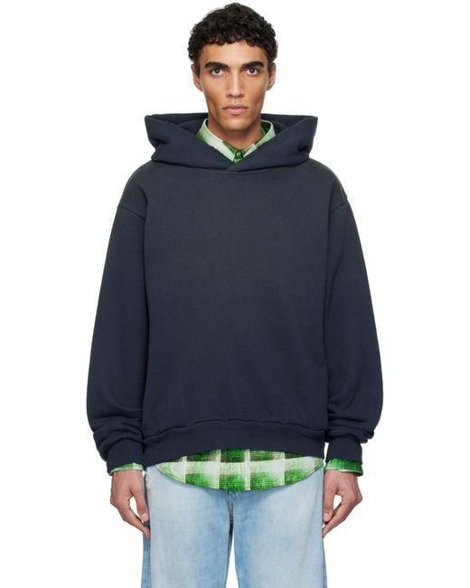 French terry hoodie. Subtle distressing and fading throughout. · Rib-knit hem and cuffs · Seam pockets · Dropped shoulders · Logo and text printed at back Supplier color: Black Colour: blue