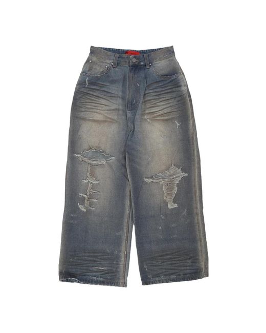 Acupuncture Men's Straight Jeans with logo and zip button closure, five-pocket Baggy fit model with distressed wash and frayed details, very wide leg and bottom with cuff. Fabric: 56% cotton, 32% cellulose fibre, 12% polyester. Hand wash or machine wash according to label instructions. Colour: grey