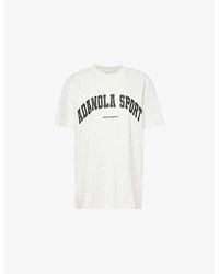 Go to SelfridgesAdanola organic-cotton T-shirt100% organic cottonSlips onOversized fit, round neck, ribbed trim at neckline, dropped shoulders, short sleeves, branding at chest and backMachine wash coldTrue to sizeModel is 5ft 10in/1.78m and wears a size smallLightweight, slight stretch Colour: brown
