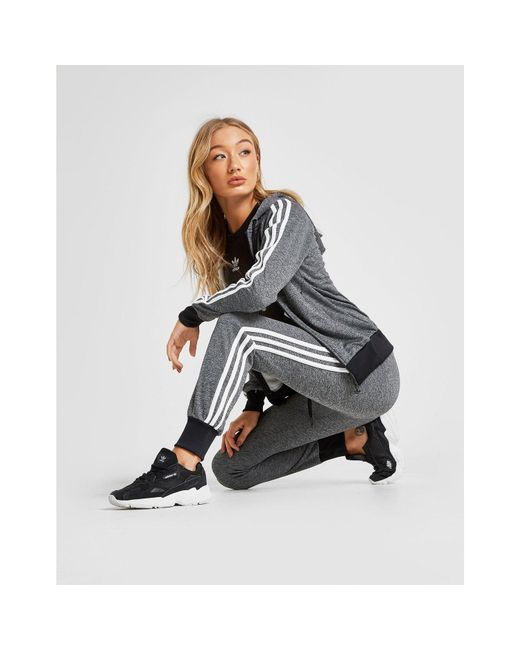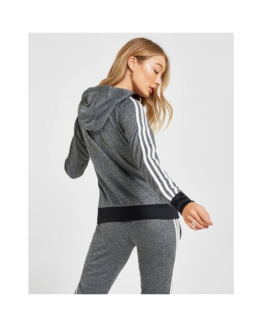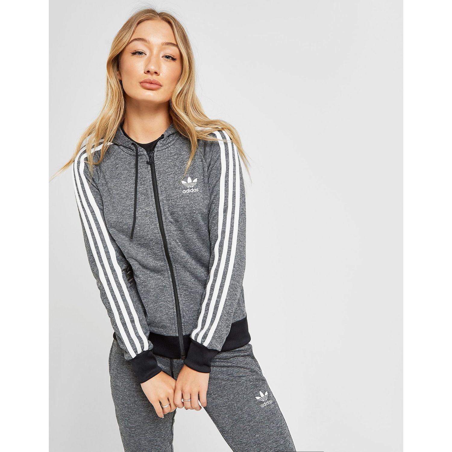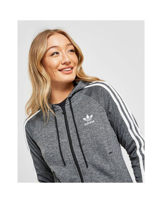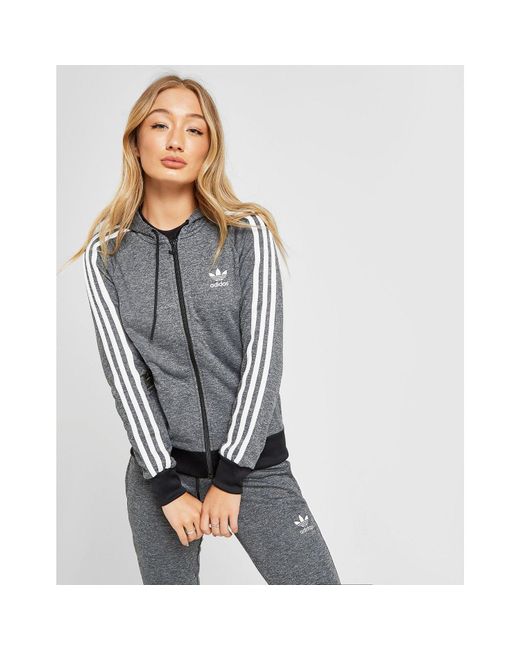 Update your 3-Stripes style with this women's 3-Stripes Full Zip Hoodie from adidas Originals. Inspired by their archives, this JD-exclusive hoodie is made from smooth poly fabric in a black melange colourway. It has a full zip fastening and an adjustable hood for extra coverage. The perfect layer for chilled days, this casual hoodie is finished up with long raglan sleeves that rep the 3-Stripes in white, as well as Trefoil branding printed to the chest. Our model is 5'8" and wears a size 8. Material: 100% Polyester. Colour: grey