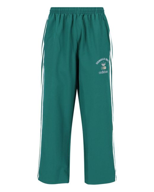 Adidas 'Originals Dept.' sports pants in green fabric with elastic mid waistband, two side zip pockets, 'Trefoil' logo print detail, iconic white side bands, wide leg.