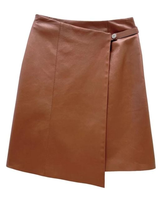 Rust brown lambskin front press-stud fastening wrap design above-knee length asymmetric hem Size: 32. Gender: Female. Material:Lambskin. Colour: brown