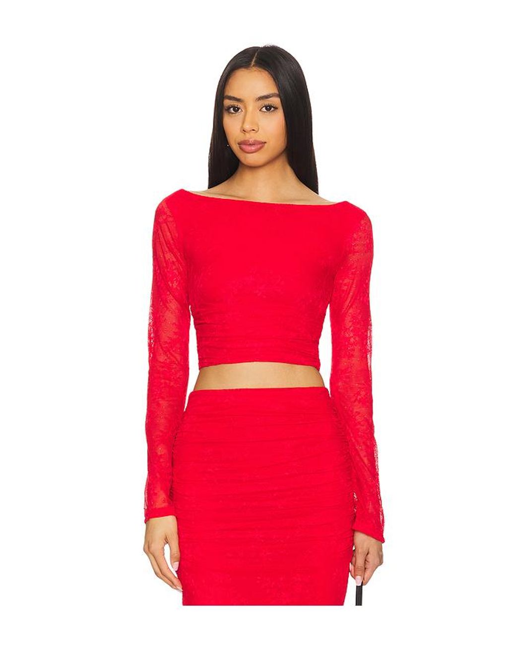 AFRM Noam Lace Top in Red. Size L. Also in XL. AFRM Noam Lace Top in Red. Size XL. Self: 92% nylon 8% spandex Lining: 95% polyester 5% spandex. Made in China. Hand wash cold. Cropped styling. Midweight lace fabric with ruched design. Item not sold as a set. AFFM-WS441. AT028897JN25. AFRM stands for an affirmation of one's self and one's style. They're a community, presenting edgy pieces that capture your spirit, your moments, your moods. Every detail is intentional, to AFRM you from the inside out. In AFRM, be beautifully, powerfully present in your world.