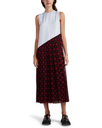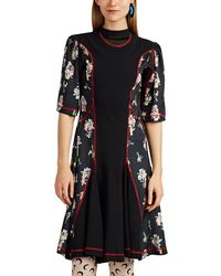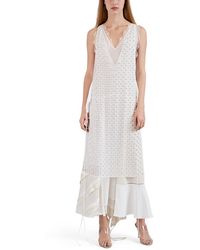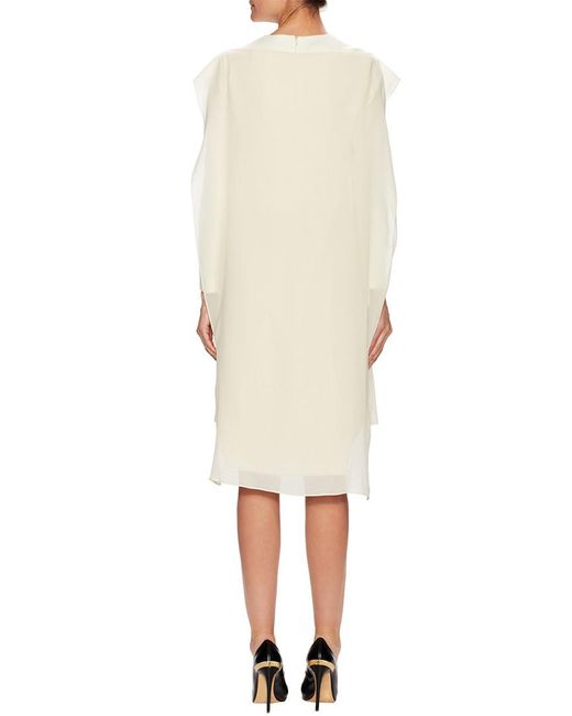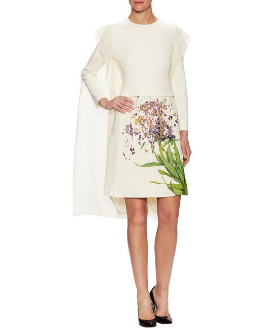 Color/pattern: cream & multicolor. Woven wool dress. Crewneck. Sheer cape. Graphic print at front skirt. Split at front skirt. Tonal topstitching and panel seaming. Hidden back zipper closure. Measurements: 30in in circumference at bust; 36in from shoulder to hem; taken from a size 4. Models height is 5 feet 9 inches.
