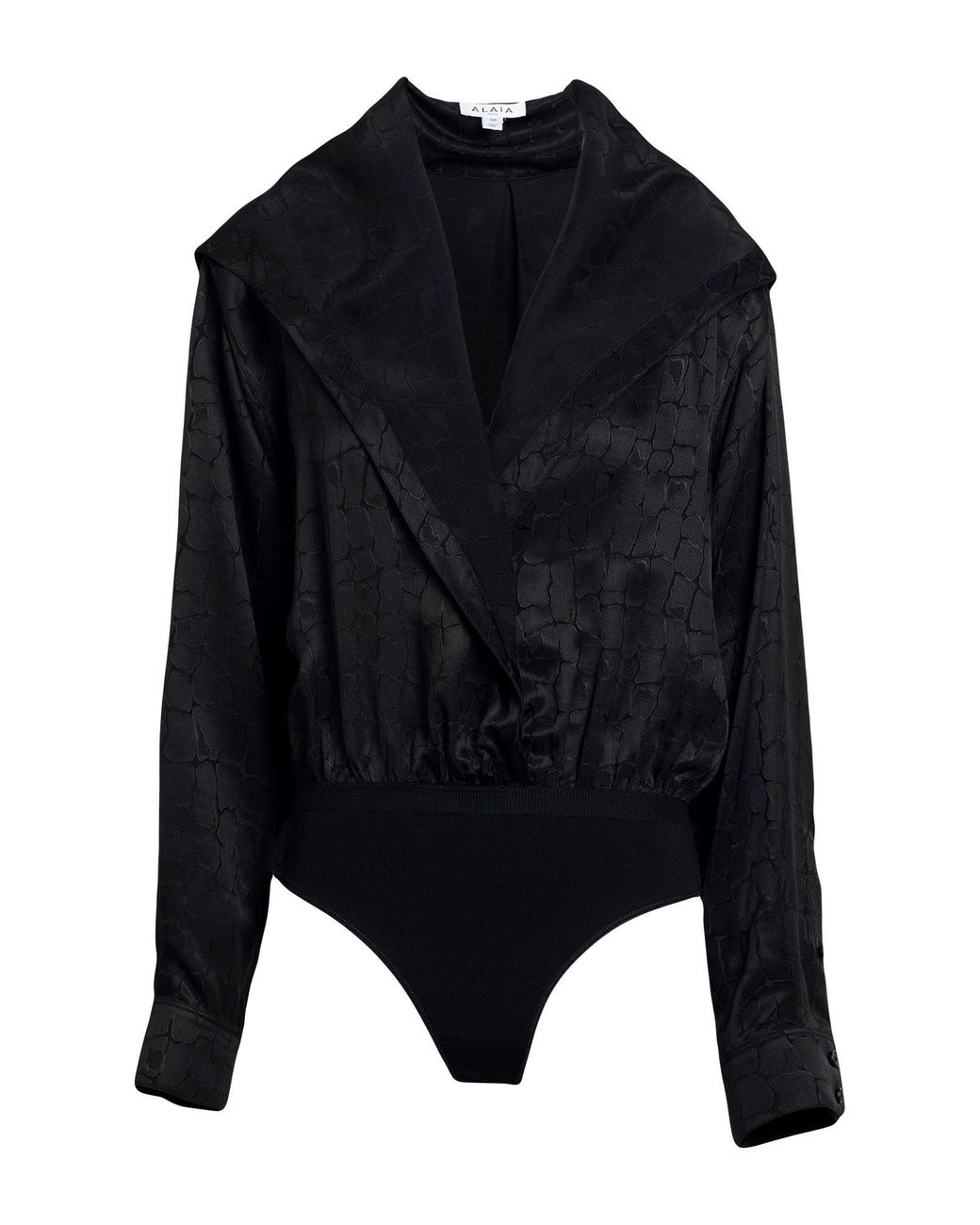 ALAÏA. jacquard, crocodile-print, no appliqués, hooded, long sleeves, buttoned cuffs, dry clean, do not bleach, do not tumble dry, this brand runs small. 55% Viscose, 45% Silk, Nylon, Elastane. Colour: black
