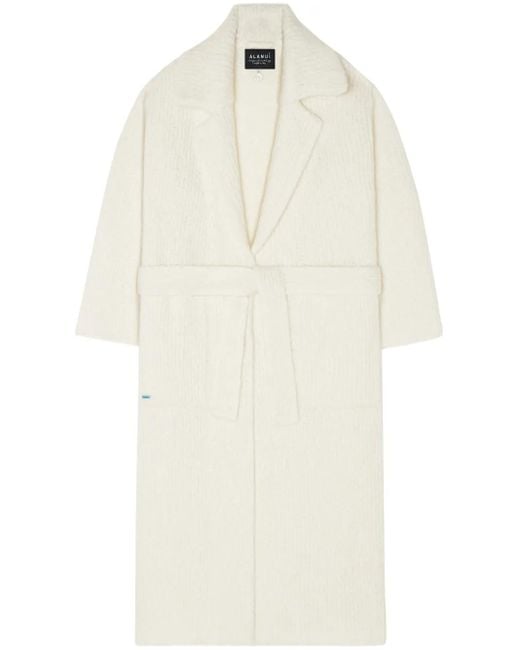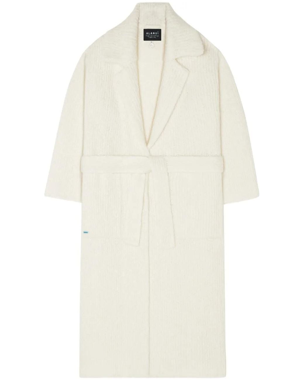 White cashmere-silk blend ribbed knit notched lapels plunging V-neck detachable and adjustable waist belt drop shoulder long sleeves two front patch pockets calf-length straight hem Size: XS. Gender: Female. Material:Silk/Cashmere. Colour: white