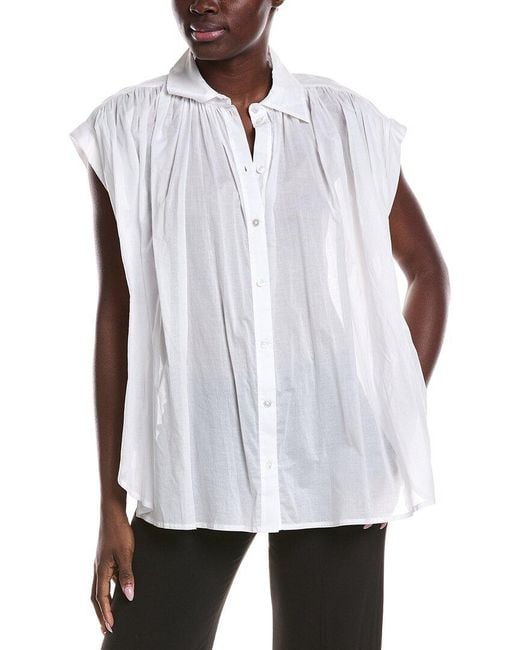 About the brand: Bold, modern, and wearable style. Nessa Top in white with ruched front, spread collar, and dolman sleeves Approximately 27in from shoulder to hem Button front 100% cotton Dry clean only Imported