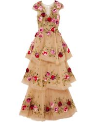 Gown Crepe de chine Satin trims Gathered Concealed hook and zip fastening at side Fully lined Fluted hem Non-stretchy fabric Mid-weight fabric Delicate dry clean. Made in Italy. Viscose 61%, Acetate 39%. Colour: multicolour