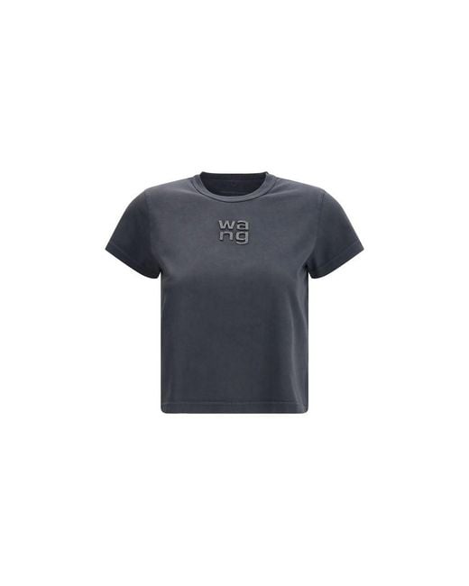 The shrunken-effect jersey T-shirt by Alexander Wang blends minimalism with a bold, modern attitude. Crafted from organic cotton, it offers a close, structured fit enhanced by a ribbed crewneck. The raised "WANG" logo at the centre, finished with tonal hotfix rhinestones, adds a subtle touch of shine that elevates the design. A piece that reflects the brand's contemporary identity with precision and unmistakable style. Season: SS26Fit: RegularComposition: 100% Cotton. Colour: blue