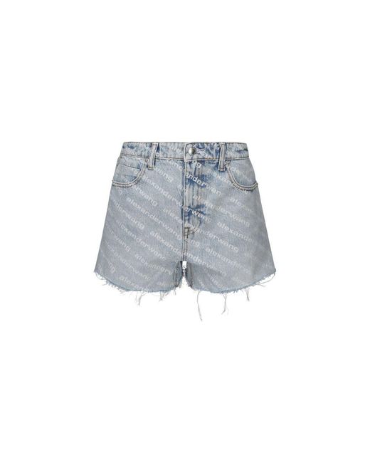 Denim Shorts by Alexander Wang, featuring a zipper and button fastening, belt loops, a five pocket design, a washed out effect, a contrasting repeating logo across the body, a logo patch at the rear and a ripped hem. Season: SS26Composition: 100% Cotton. Colour: blue